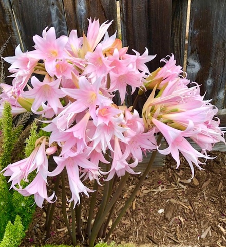 I just returned from traveling, let the pups out, looked way back toward the fence and thought my eyes were playing tricks. Naked Ladies. Right here in our own back yard.